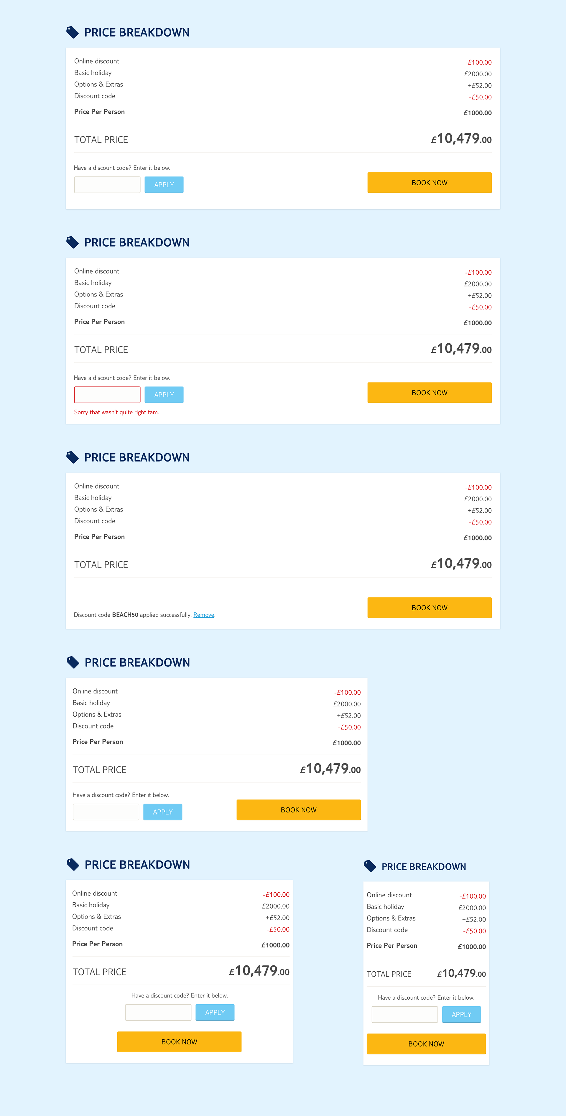 Price breakdown and voucher code entry box on the book summary page. Covering each state and different device breakpoints.
