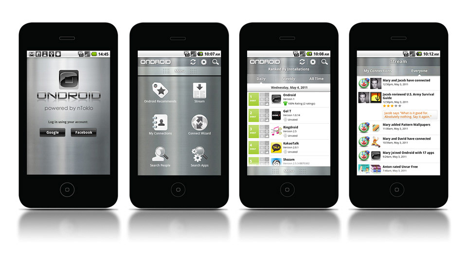 Ondroid mobile app for Android. An app discovery and sharing community where users can rate, recommend and see what apps their friends are using. User Experience, User Interface design, logo design, icon design and creation of all required app assets.